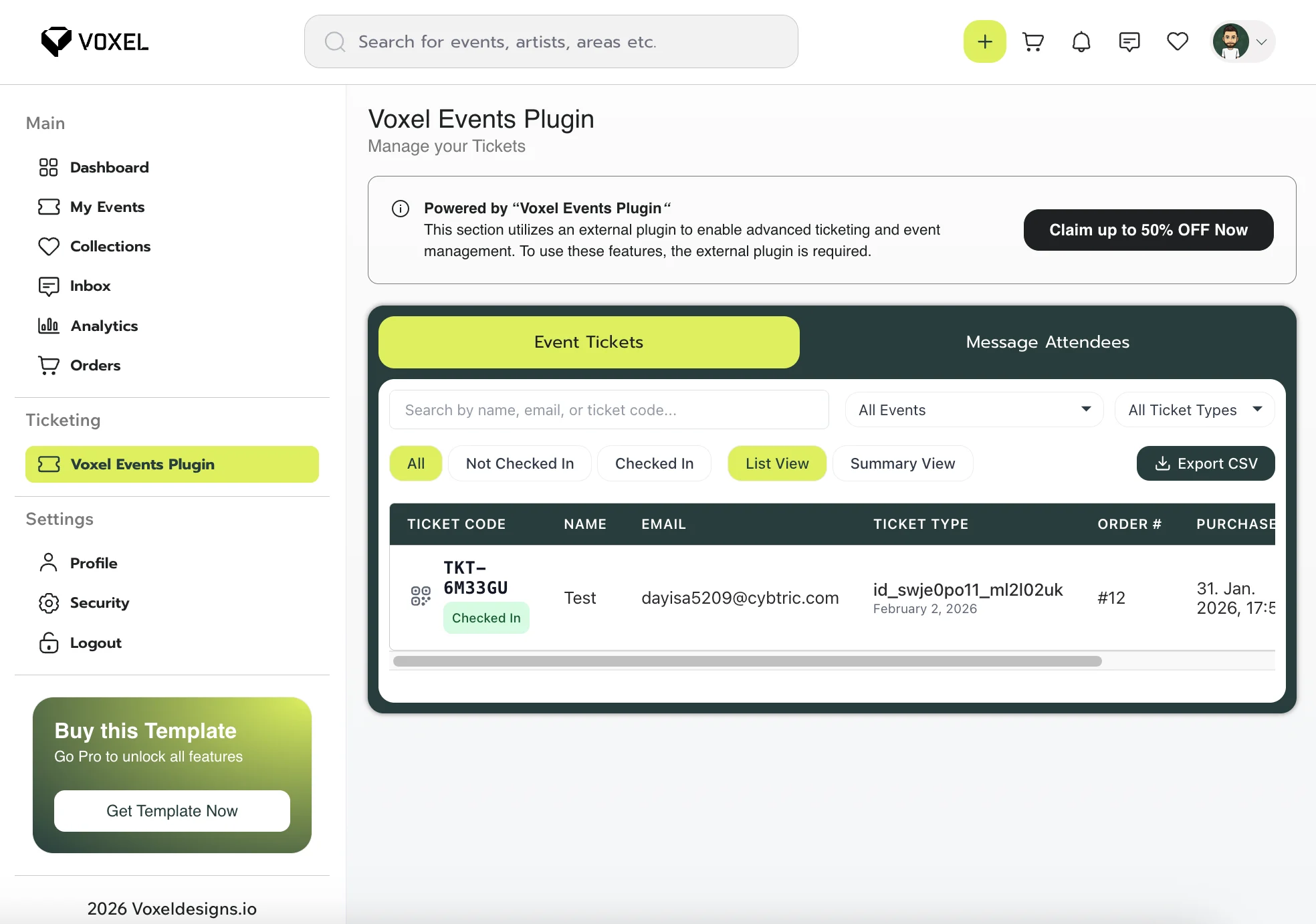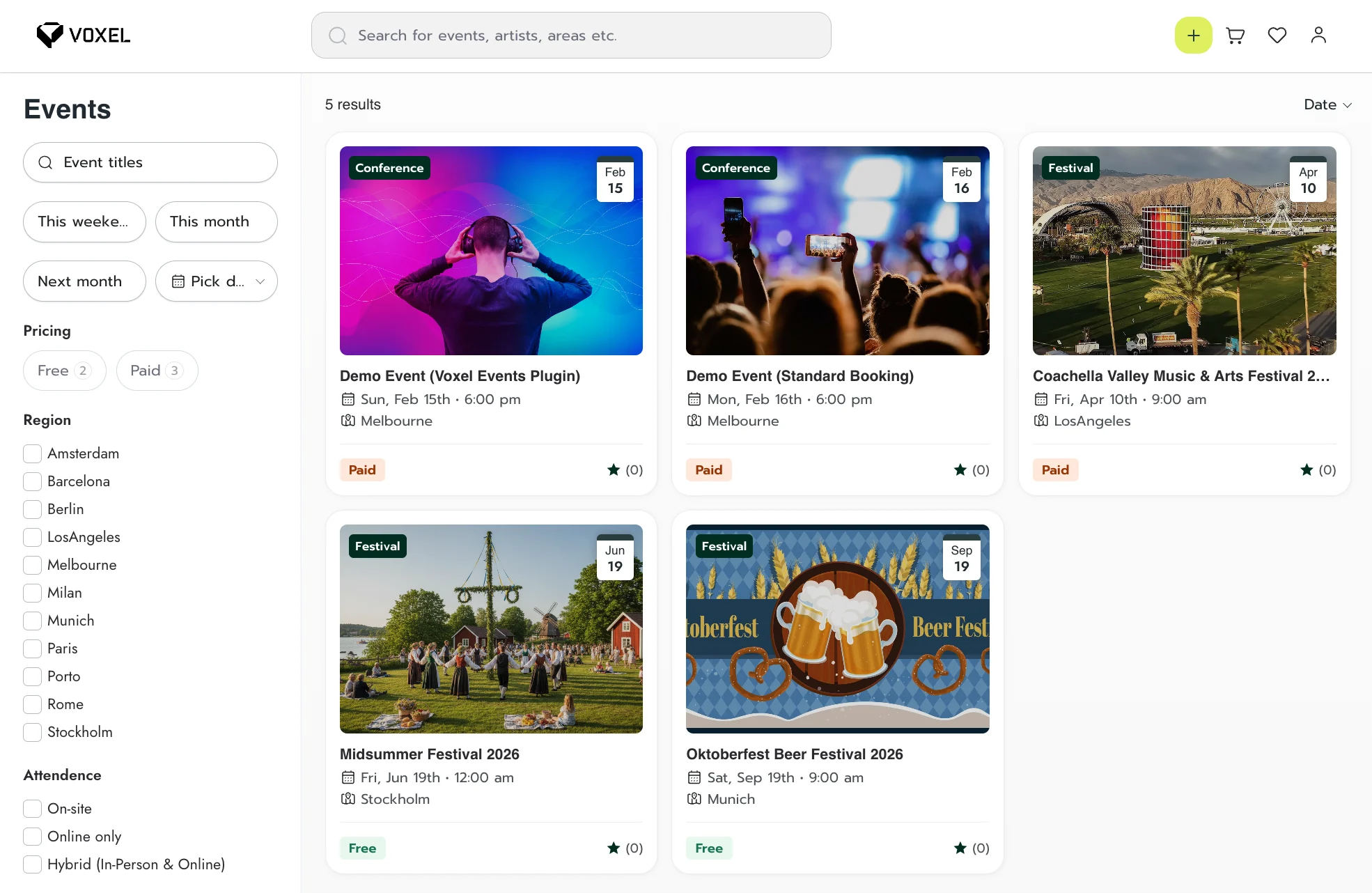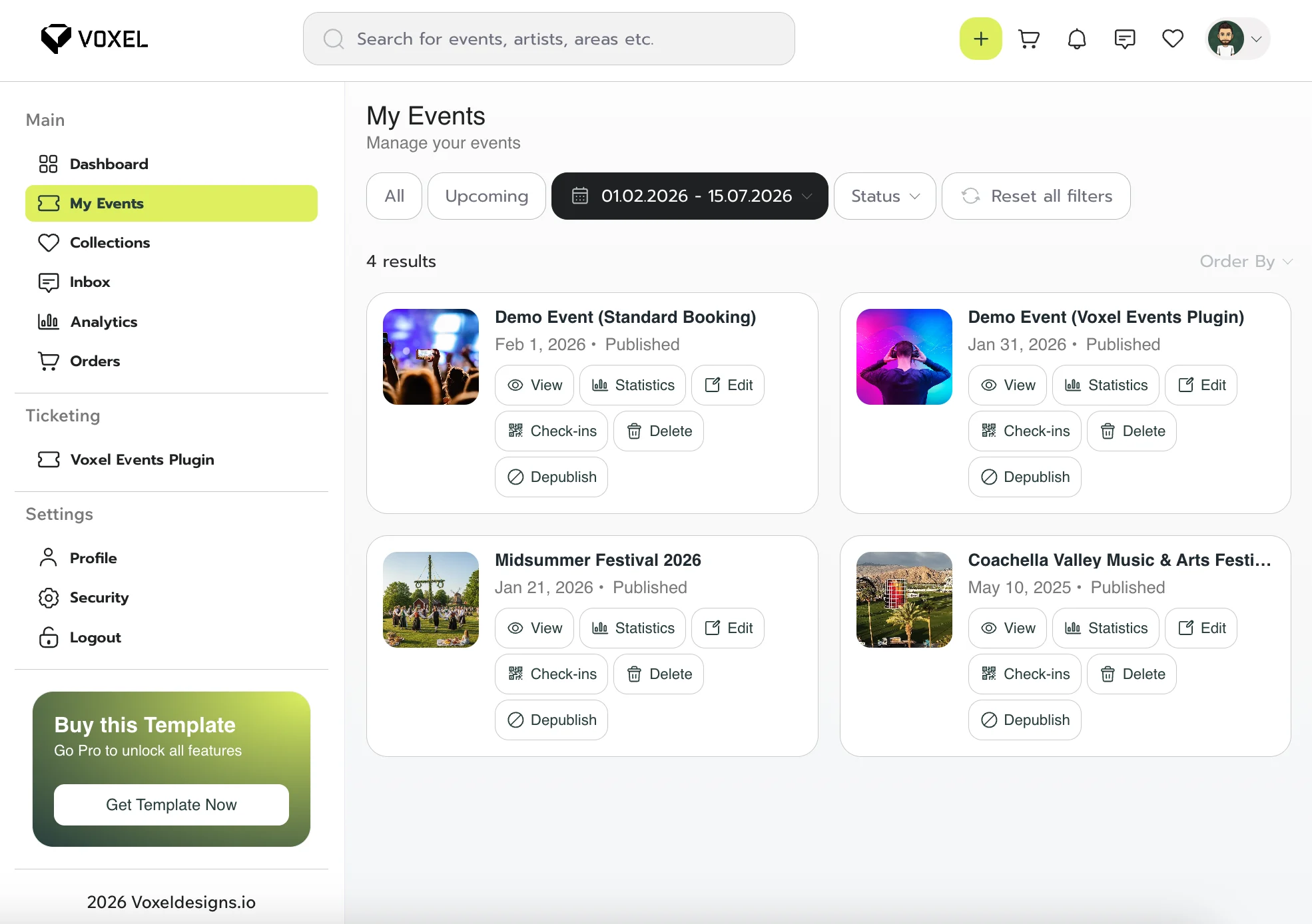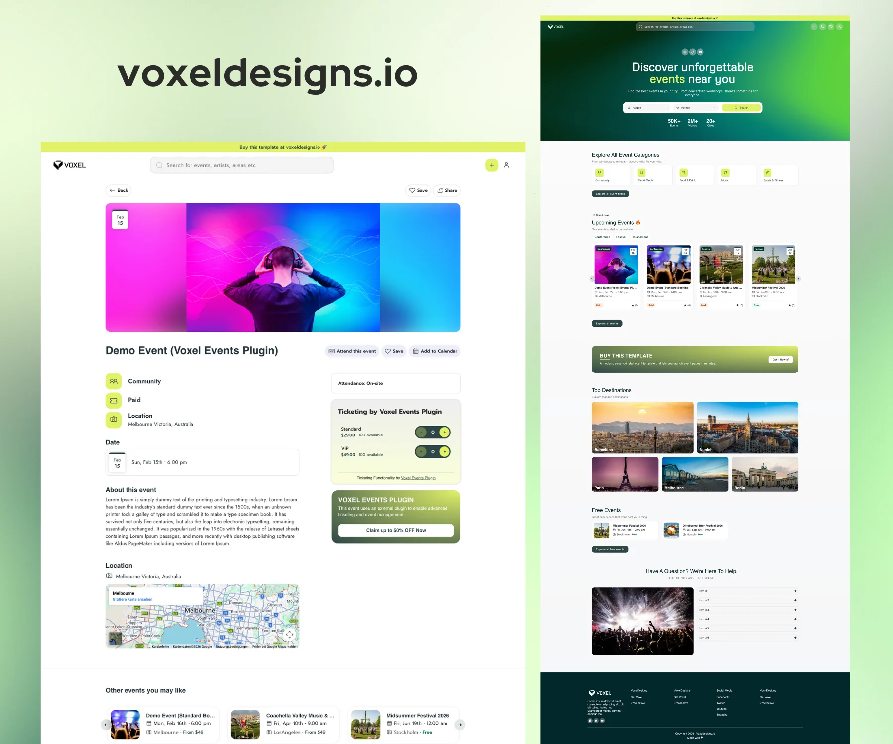 The ticketing features shown in this design template are provided by Voxel Events and are for demonstration purposes only.